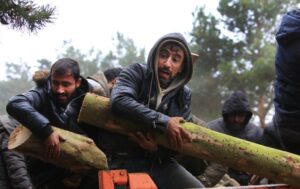 11月14日,在白俄罗斯靠近波兰边境的难民点,人们搬运用于取暖的木材。(新华社发,任科夫摄)