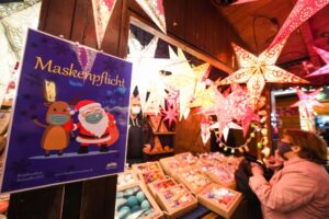 11月22日,德国法兰克福圣诞市场一处摊位旁贴着“必须戴口罩”防疫提示牌。(新华社记者逯阳摄)