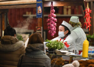 11月22日,在德国法兰克福“圣诞市场”,戴口罩的工作人员为顾客服务。(新华社记者 逯阳 摄)