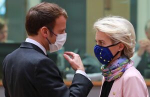 10月21日,在位于比利时布鲁塞尔的欧盟总部,法国总统马克龙(左)与欧盟委员会主席冯德莱恩交谈。(新华社发,欧盟供图)