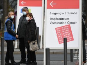 11月25日,在德国法兰克福,工作人员在一处新冠疫苗中心外引导人们有序接种。(新华社记者逯阳摄)