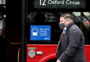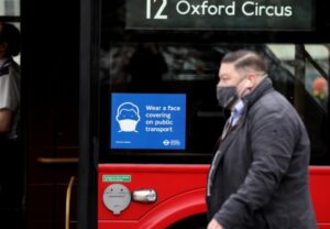 11月24日,英国伦敦的公共汽车上贴着提醒人们佩戴口罩的防疫告示。(新华社记者李颖摄)