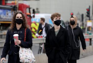 11月24日,人们在英国伦敦佩戴口罩出行。(新华社记者李颖摄)