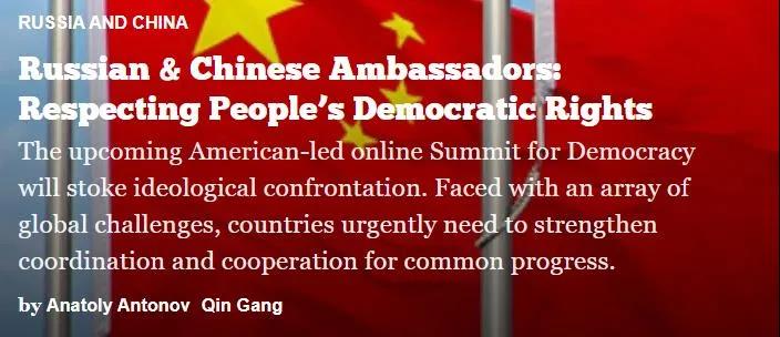 11月26日,中国驻美大使秦刚、俄罗斯驻美大使安东诺夫在美国《国家利益》杂志刊发联合署名文章,批驳美国即将召开的所谓“民主峰会”,称其“在世界上煽动意识形态对立和矛盾,制造新的分裂”。