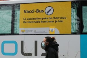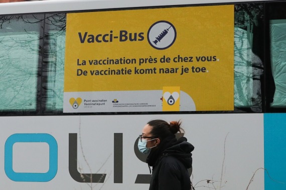 11月30日,一名女子经过比利时布鲁塞尔的一辆新冠疫苗接种巴士。(新华社记者郑焕松摄)