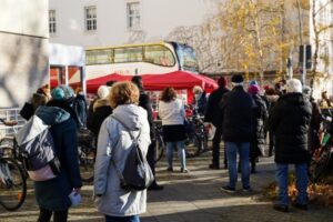 11月22日,德国柏林一辆“疫苗巴士”前人们排队等待接种新冠疫苗。(新华社发,斯特凡·蔡茨摄)