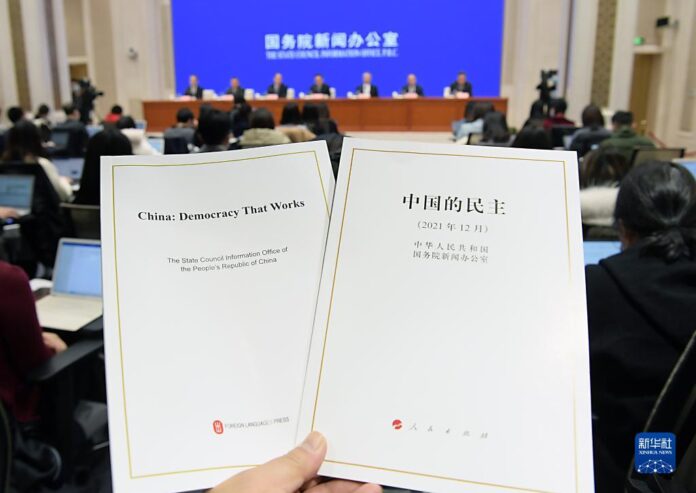 这是12月4日在发布会现场拍摄的《中国的民主》白皮书中、英文版。 新华社记者 李贺 摄