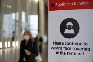 11月30日,一名旅客经过英国伦敦希思罗机场内的防疫告示。(新华社记者李颖摄)