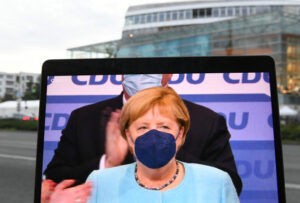 这是9月26日在德国柏林德国基督教民主联盟(基民盟)总部前拍摄的德国总理默克尔出席集会的视频直播画面。(新华社记者逯阳摄)