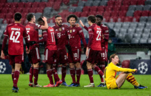 E组中,之前5轮只打进两球、获胜两场的巴萨当日客场对阵一路连胜、已提前两轮确定出线的拜仁。主队上半场依靠穆勒的头球和萨内的世界波取得2:0的领先,下半场又由穆西亚拉推射破门,将比分定格在3:0。