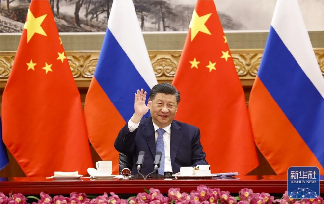 习近平强调,当前,世界百年变局和世纪疫情交织影响,世界进入动荡变革期。中俄关系经受住各种风浪考验,展示出新的生机活力。我同总统先生通过多种方式就重大议题保持沟通和协调,共同为中俄关系把舵领航。双方正式宣布《中俄睦邻友好合作条约》延期并赋予其新的时代内涵,在涉及彼此核心利益问题上坚定相互支持,捍卫了各自国家尊严和两国共同利益。