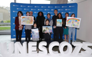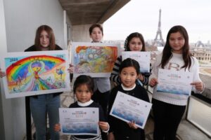 12月15日,在法国巴黎联合国教科文组织总部,青少年绘画邀请赛获奖的部分小选手和法国前体育部部长、击剑项目奥运会冠军劳拉·弗莱赛尔(后排左四)、法国法兰西岛大区的奥林匹克和体育委员会主席埃弗利娜·西里吉(后排左五)、法中文化艺术交流中心主席佟爱明(左一)等嘉宾合影留念。新华社记者高静摄
