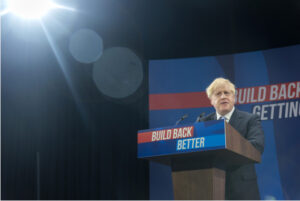 10月6日,英国首相鲍里斯·约翰逊在曼彻斯特进行保守党年会闭幕发言。(新华社发,雷伊·唐摄)