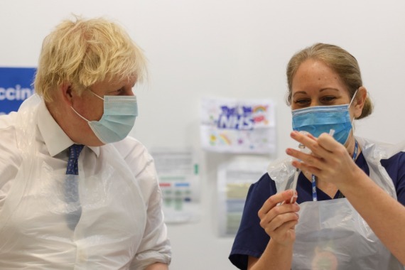 12月16日,在英国拉姆斯盖特,英国首相鲍里斯·约翰逊(左)参观当地新冠疫苗接种中心时与工作人员交谈。(新华社发,英国首相府供图)