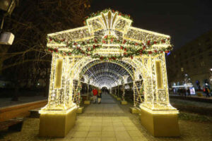 12月8日,市民走在波兰华沙一处彩灯装点的长廊里。(新华社发)