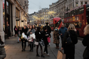 11月24日,人们提着购物袋走在英国伦敦市中心的摄政街。(新华社发,蒂姆·爱尔兰摄)