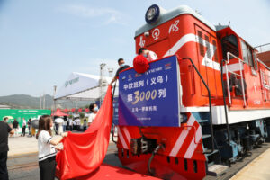 8月19日,在铁路义乌西站,第3000列“义新欧”中欧班列即将启程。(新华社发,龚献明摄)
