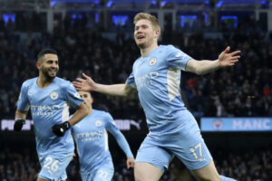 12月26日,曼彻斯特城队球员德布劳内(右)在比赛中庆祝进球。新华社/美联