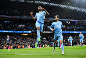 12月26日,曼彻斯特城队球员斯特林(前左)在比赛中庆祝进球。新华社/路透