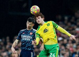 12月26日,阿森纳队球员蒂尔尼(左)与诺维奇队球员萨金特在比赛中争顶。新华社/路透
