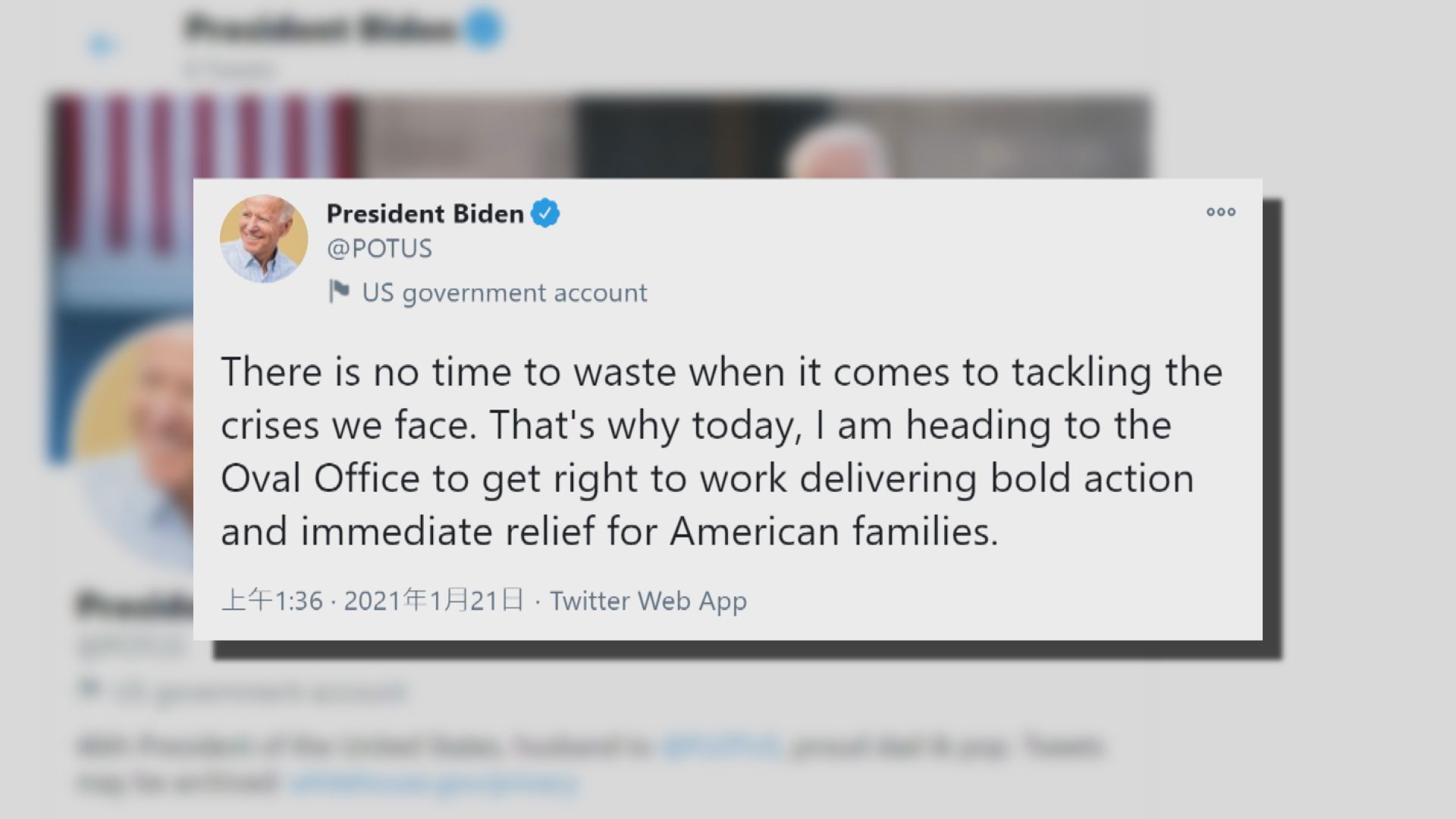 拜登就職後隨即使用美國總統官方Twitter帳戶發帖文。