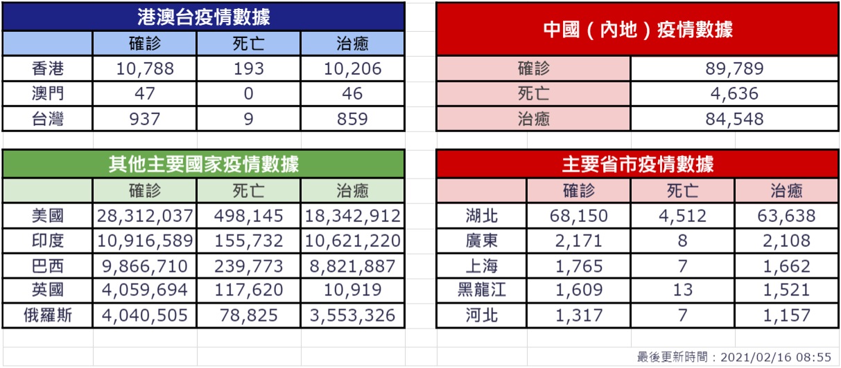 中國內地過去一日新增16宗新型肺炎確診病例,全部由境外輸入,廣東有8宗,上海5宗,陝西2宗,四川1宗,沒新增死亡和疑似病例。