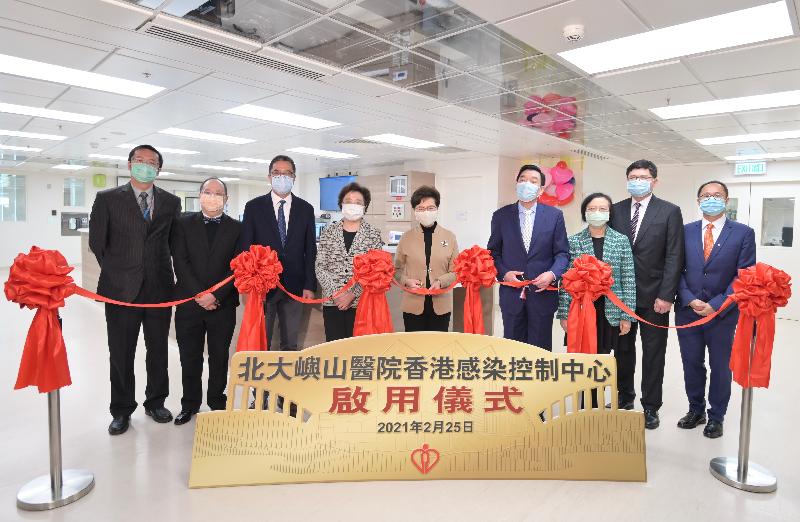 行政長官林鄭月娥今日(二月二十五日)出席北大嶼山醫院香港感染控制中心啓用儀式。圖示林鄭月娥(中)、中央人民政府駐香港特別行政區聯絡辦公室副主任仇鴻(左四)、食物及衞生局局長陳肇始教授(右三)、發展局局長黃偉綸(左三)、醫院管理局主席范鴻齡(右四)、醫院管理局行政總裁高拔陞醫生(右二)及其他嘉賓在儀式上合照。