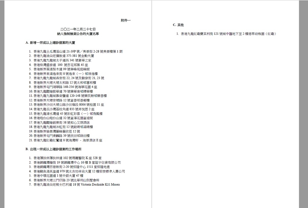 衞生防護中心昨日公布加強工作場所的強制檢測,要求出現一宗或以上確診個案的工作場所納入強制檢測。政府刊憲,將29個指明地點納入強制檢測,包括21座大廈、7個工作場所,及紅磡德萃幼稚園的員工及學生,要求相關人士在明天或之前接受檢測。