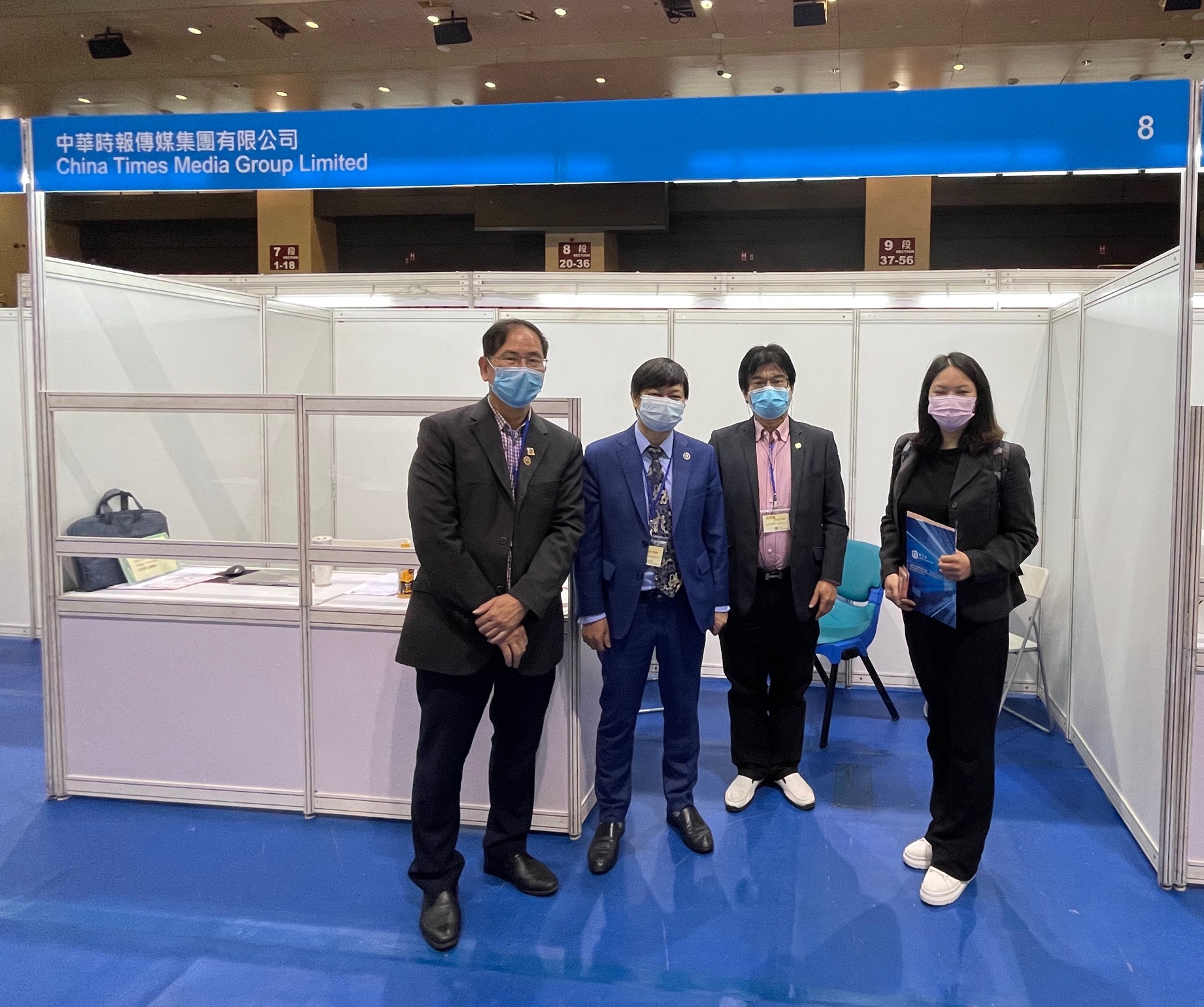 中華時報傳媒集團主席曾曉輝(左二)等在展覽會攤位前