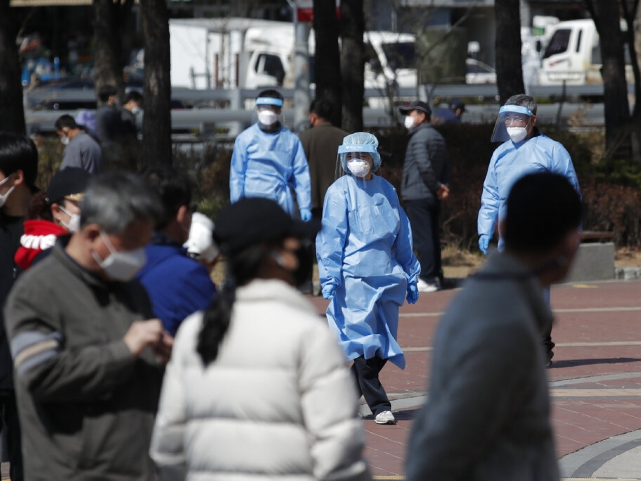 在首爾一個檢測地點,民眾等候接受病毒檢測,身穿保護衣物的醫護人員在場協助。(美聯社資料圖片)
