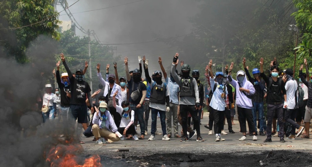 在北部实皆省,再有民众无视军方血腥镇压上街示威,举起象徵对抗极权的三指手势,悼念在示威中被军方镇压杀害的民众。