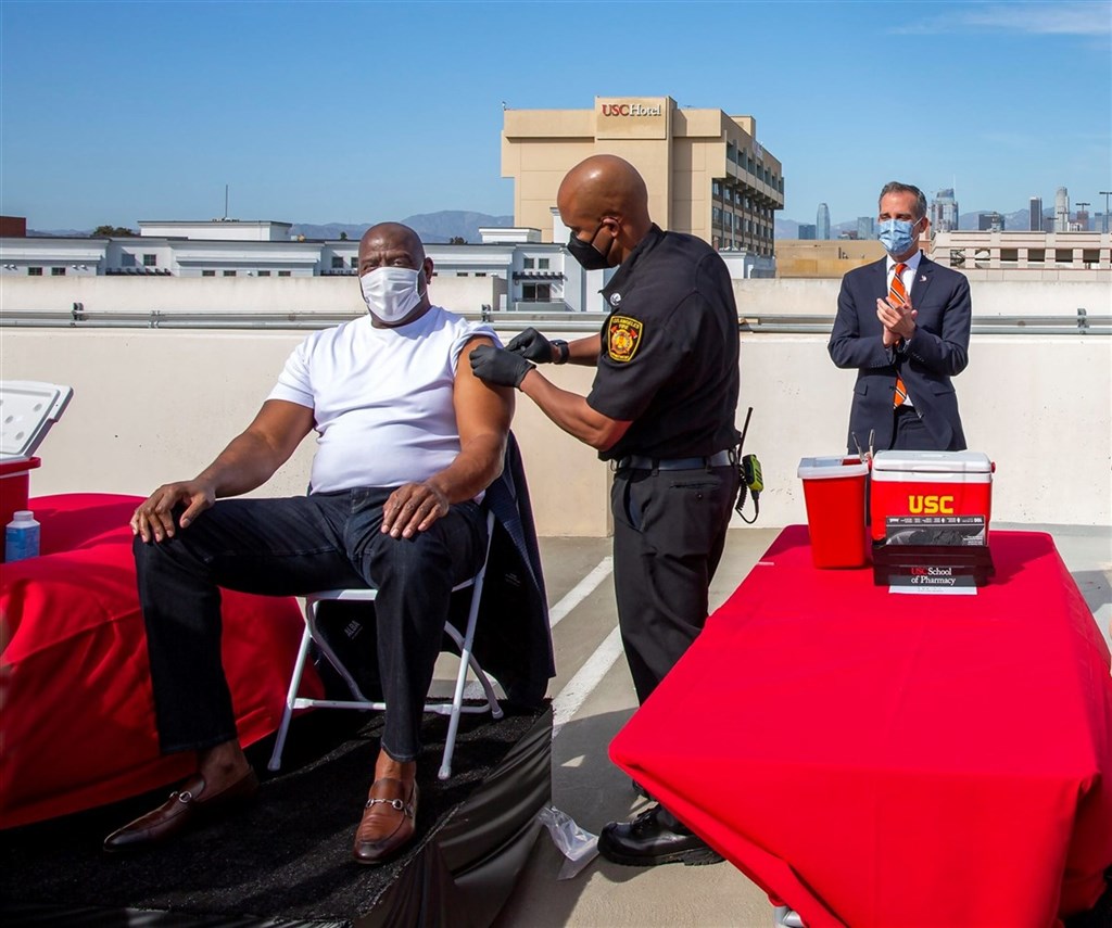 加州從去年12月中開始施打疫苗,截至3月24日的統計,人口約1000萬的洛杉磯郡已注射379萬劑,其中123萬劑是第2劑,已完成接種的人口比例為15.6%。