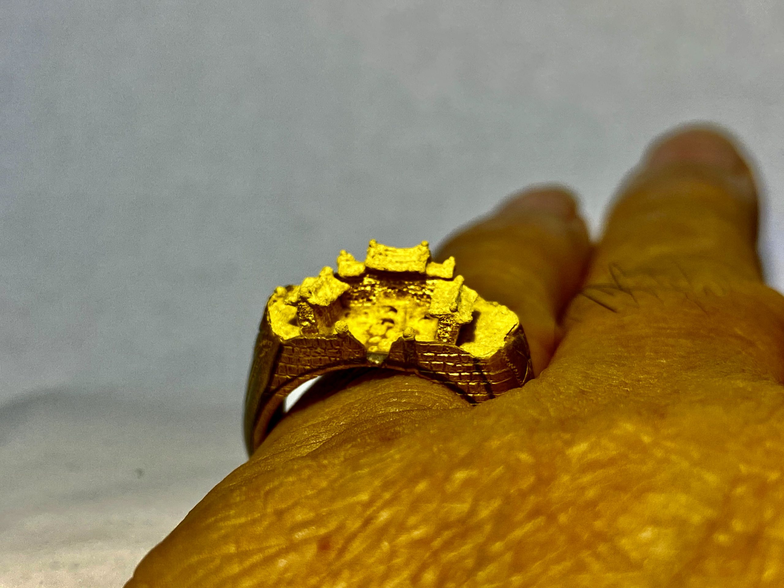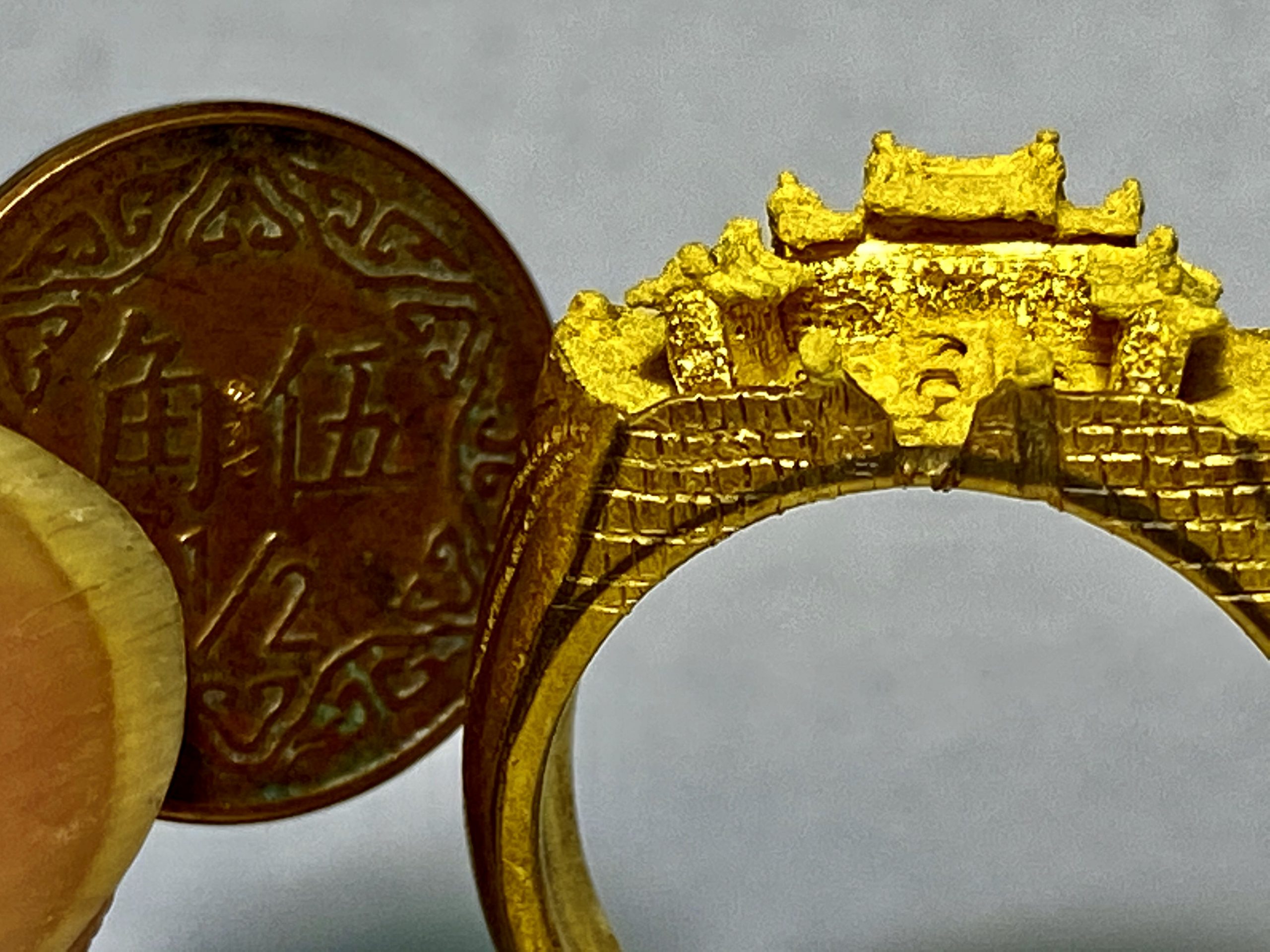 黃金雕刻時他困難的地方是,挑起的殘渣比較不容易清除,屬於比較有黏性的金屬,是一個失敗的原因,還有那麼小的黃金素材要如何固定好他,也是很困難的一件事,那麼渺小的黃金材料雕刻的時候,閉氣雕刻也很重要,一個顫抖黃金素材就不見了,又必須重新再來,也是最傷腦筋的部分,雕刻好的黃金屋,必須透過放大鏡才能夠看得清楚!三合院有主廳以及左右兩邊,還有一個院子,還有一圈圍牆及大門,圍牆的大門上還刻了兩個字,春、福!非常的生動感人,很有思古幽情的氛圍感覺,雕刻好的”黃金屋”三合院古厝放在戒指裏面,顯得很渺小,這是一件曠世經典巨作,也是黃金雕刻工法最困難的一件作品,整體的感覺很美觀、很前衛,是一件難得的作品。