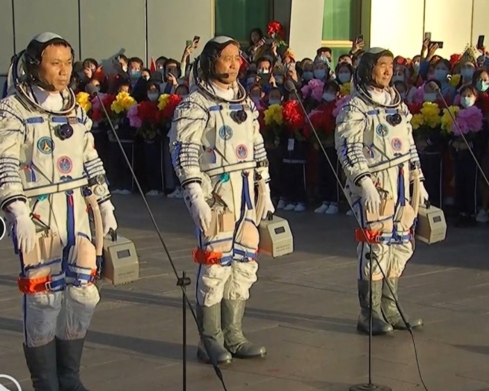 中華時報/華聞社6月17日綜合報導)神舟十二號載人飛船,在早上9時許在酒泉衛星發射中心,經由長征二號F遙十二運載火箭搭載升空。航天員出征儀式早上約6時半舉行。