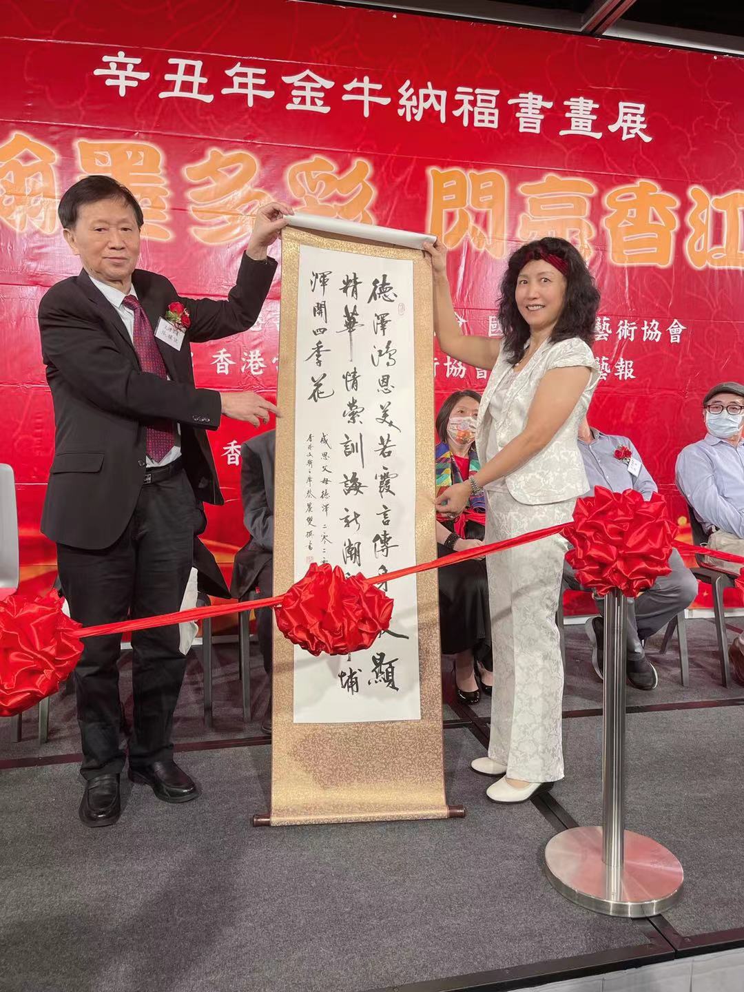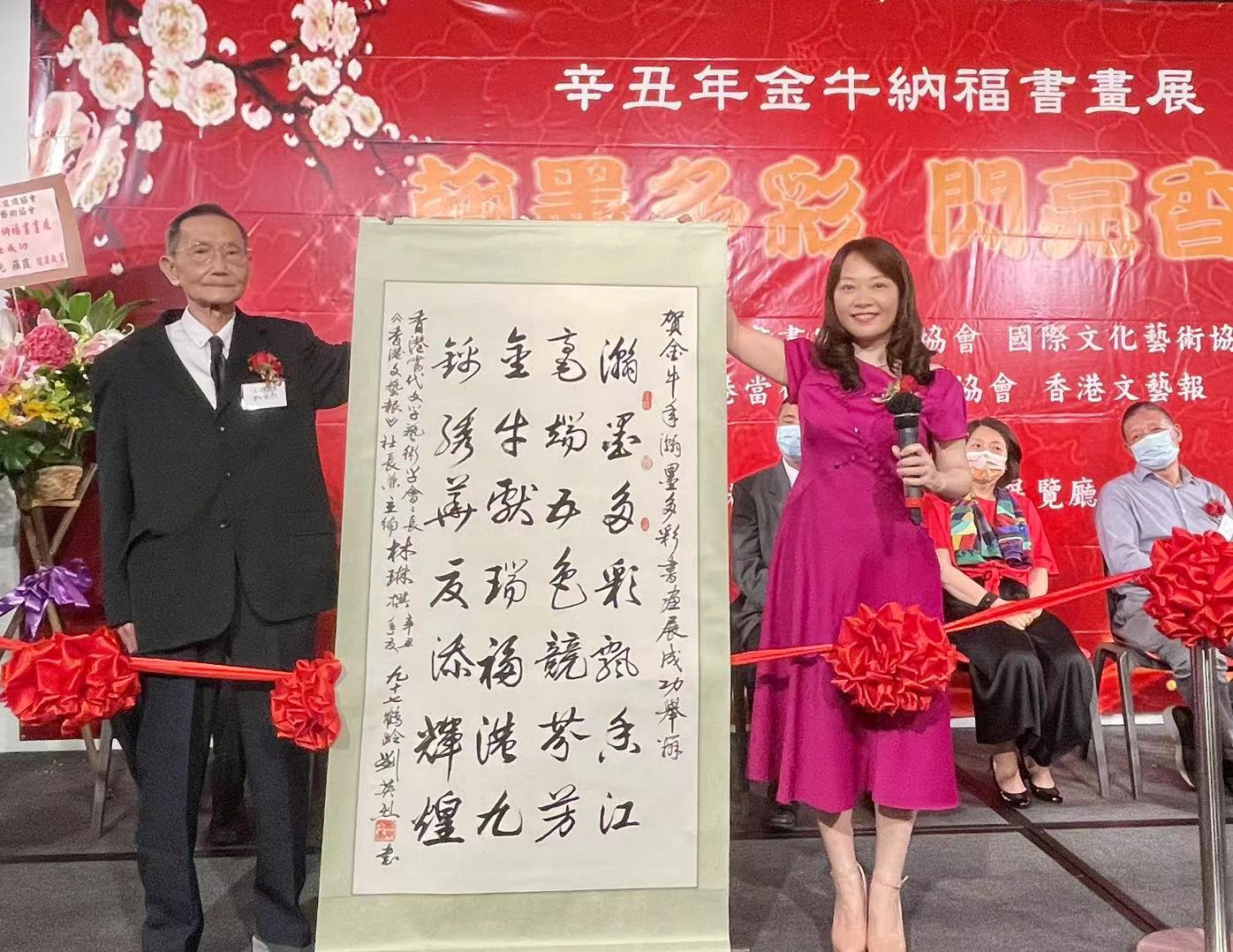 香港文化藝術界聯會主席蔡麗雙向大會贈送了其撰書的《感恩父母德澤》的墨寶。香港當代文學藝術協會會長、《香港文藝報》社長兼主編林琳撰寫了情深意長的賀詩「翰墨多彩飄香江/毫端五色競芬芳/金牛獻瑞福港九/錦繡華夏添輝煌」,由九十七歲高齡的書法家劉英烈書寫,共同登場誦讀致意。