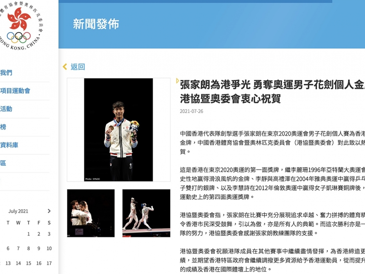 港隊代表張家朗在東京奧運男子花劍個人賽奪金,港協暨奧委會致以熱烈祝賀。