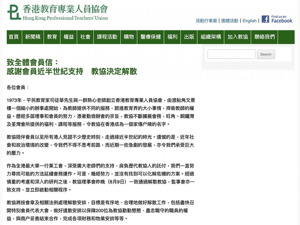 教協向全體會員發信,指過去陪伴所有港人見證不少歷史時刻,走過接近半世紀的時光,遺憾的是,近年社會和政治環境的改變,令教協不得不思考前路,加上近期一些急劇的發展,也令教協承受巨大的壓力。