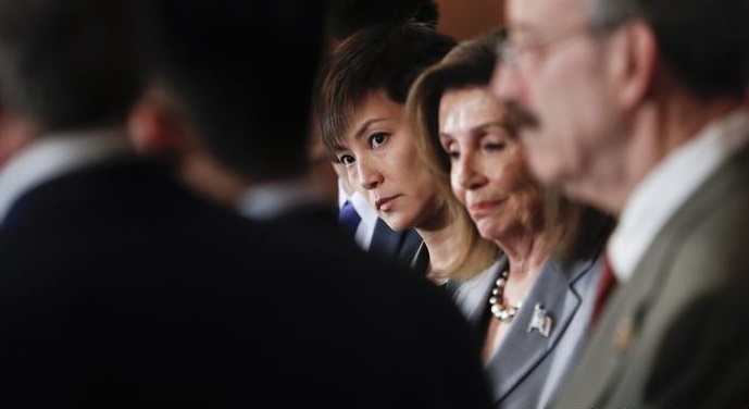 2019年9月18日,何韵诗在华盛顿与美国众议院院长佩罗西出席记者会。