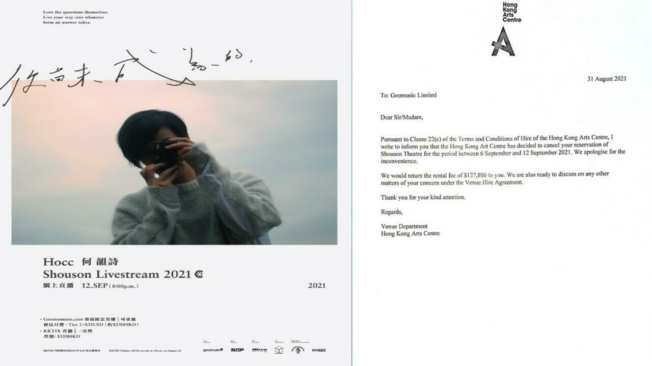 支持民主运动的著名歌手何韵诗,在个人演唱会开始前一星期,突然接获艺术中心通知,引用危害公众秩序及安全的条款拒绝租场反对有关决定和理由,但面对「无法解释的突变和红线」,个唱会改在原来「尾场」的12日于网上进行,强调「有天有地,就有舞台」。