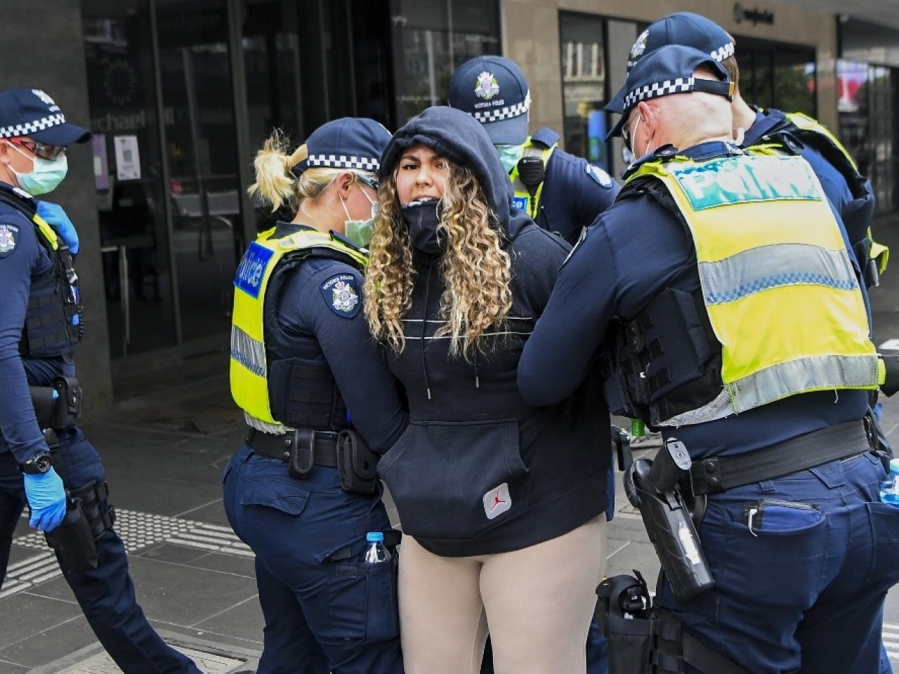 在墨爾本,有示威者抗議封鎖措施時被捕。(法新社)