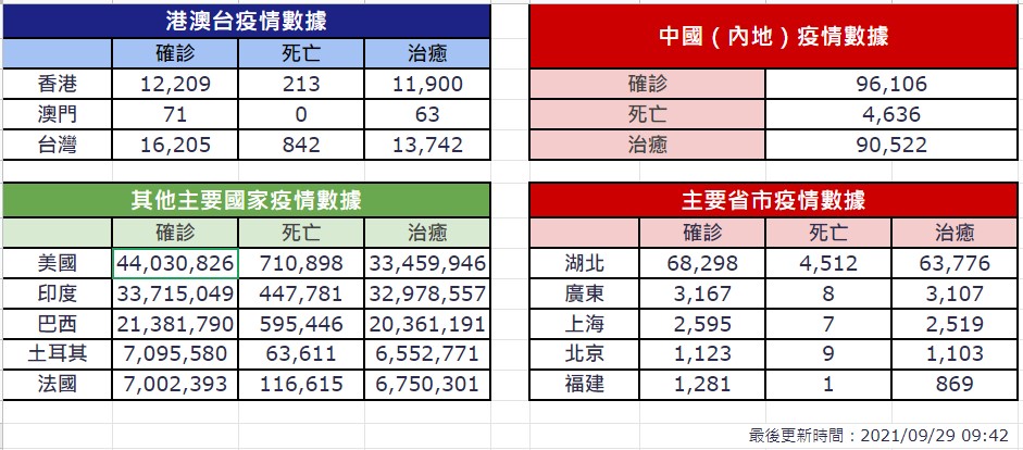 (中華時報/華聞社香港9月29日綜合報導)美國約翰霍普金斯大學(Johns Hopkins University)網站追蹤數據顯示,截至香港29日上午7時,全球至少476萬2133人病逝於COVID-19,至少2億3266萬4679人確診。