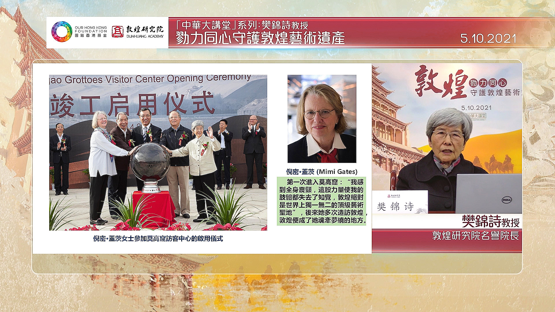 (中華時報/華聞社香港10月6日報導),2021年10月5日,由團結香港基金(基金會)主辦、敦煌研究院協辦的「中華大講堂」視像論壇,邀得敦煌研究院名譽院長樊錦詩教授以《勠力同心守護敦煌藝術遺產》為題主講,細說幾代莫高窟人至善至美的奉獻精神與保育弘揚國寶的重要性。