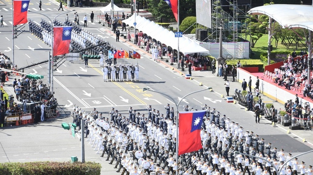 中華民國中樞暨各界慶祝110年國慶大會」10日上午在總統府前廣場舉行,三軍聯合樂儀隊進場。