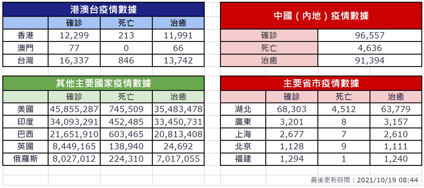 (中華時報/華聞社香港10月19日綜合報導)美國約翰霍普金斯大學(Johns Hopkins University)網站追蹤數據顯示,截至香港19日上午7時,全球至少490萬3975人病逝於COVID-19,至少2億4104萬7469人確診。
