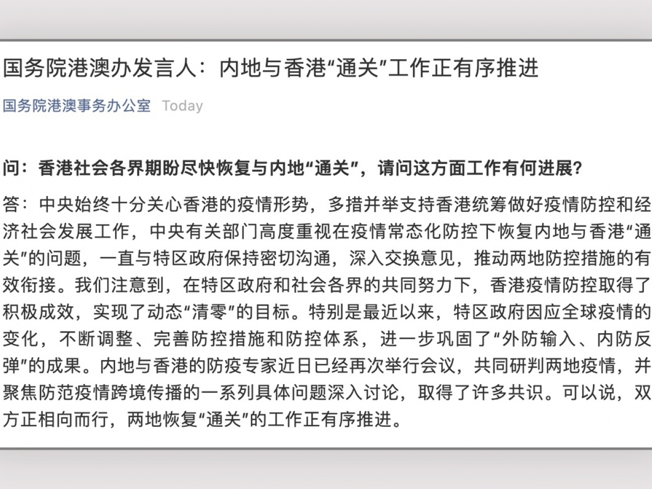 国务院港澳办表示,内地与香港恢复「通关」工作正有序推进,双方正相向而行。