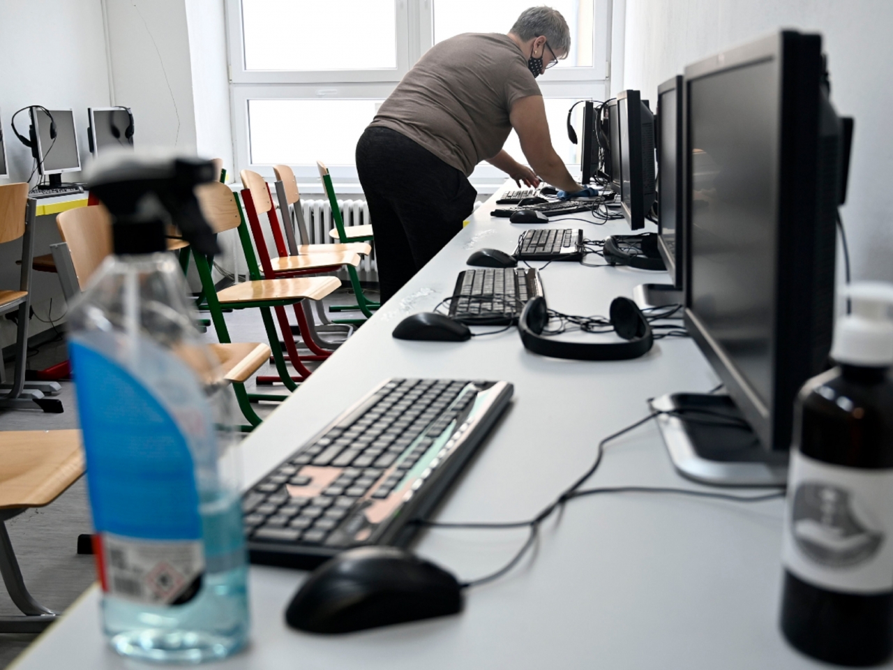 斯洛伐克是疫苗接種率較低的歐洲國家之一。圖為清潔人員在班房內消毒的情況。(美聯社資料圖片)