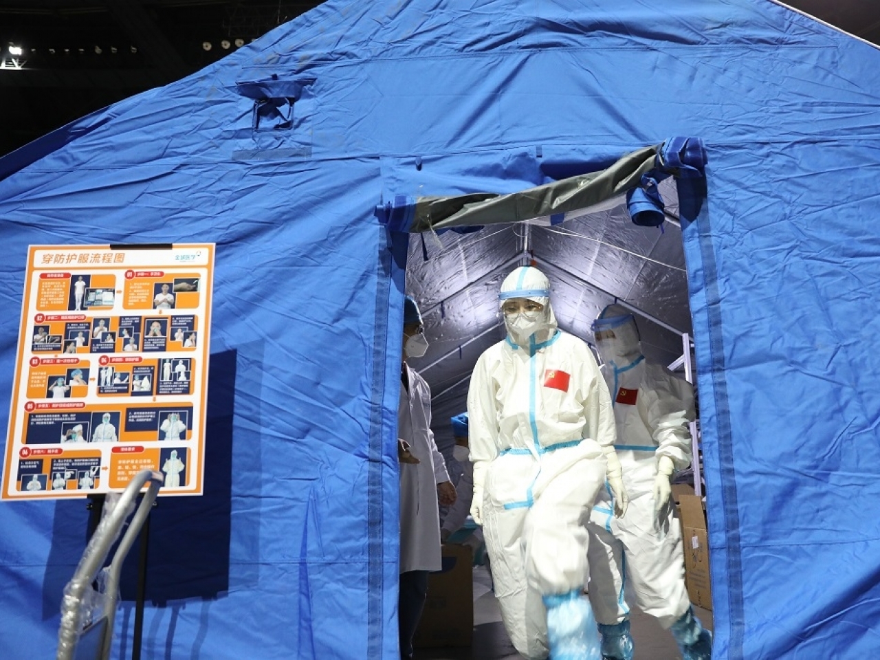 大連方艙核酸檢測實驗室工作人員走出更衣室,準備進入實驗室。(新華社資料圖片)