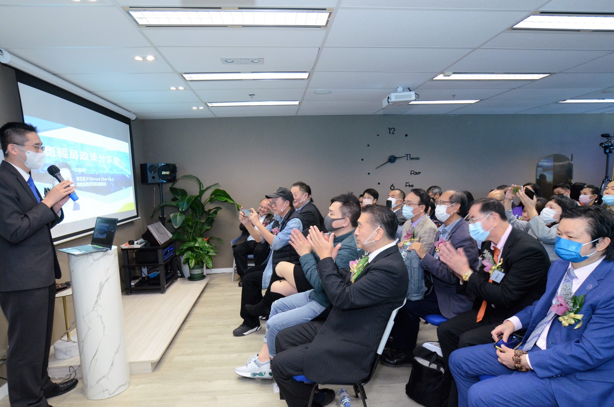 陳百里在分享會上介紹,為紓緩中小企資金周轉(壓力),政府在去年四月推出了「中小企融資擔保計劃」的百分百特別擔保產品,為企業提供信貸擔保,這項產品非常受業界歡迎。 除了紓緩中小企的資金壓力外,政府亦致力幫助中小企開拓商機。先後兩度向「BUD專項基金」合共注資35億元,將每家企業的最高資助額提高三倍至六百萬元,亦將資助地域範圍由只包括內地及東盟市場,大幅擴闊至三十七個已與香港簽署自由貿易協定及/或促進和保護投資協定的經濟體,令中小企可以有更多資金拓展更多海外市場。