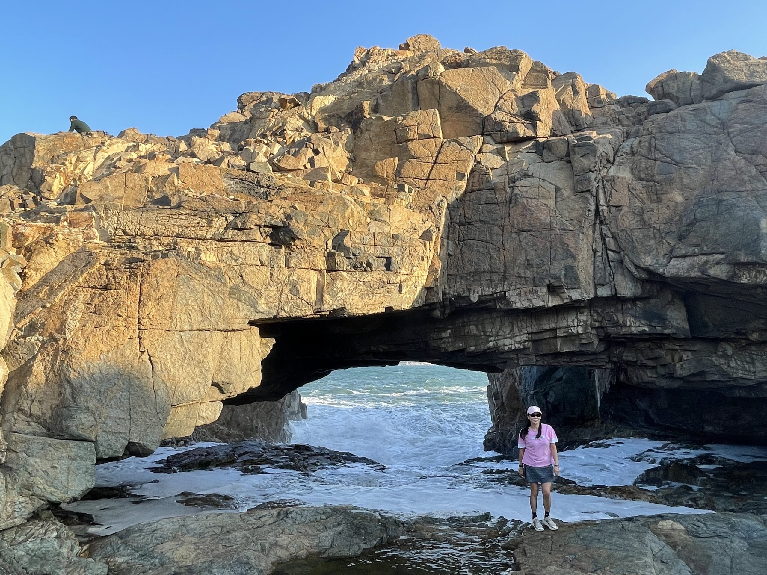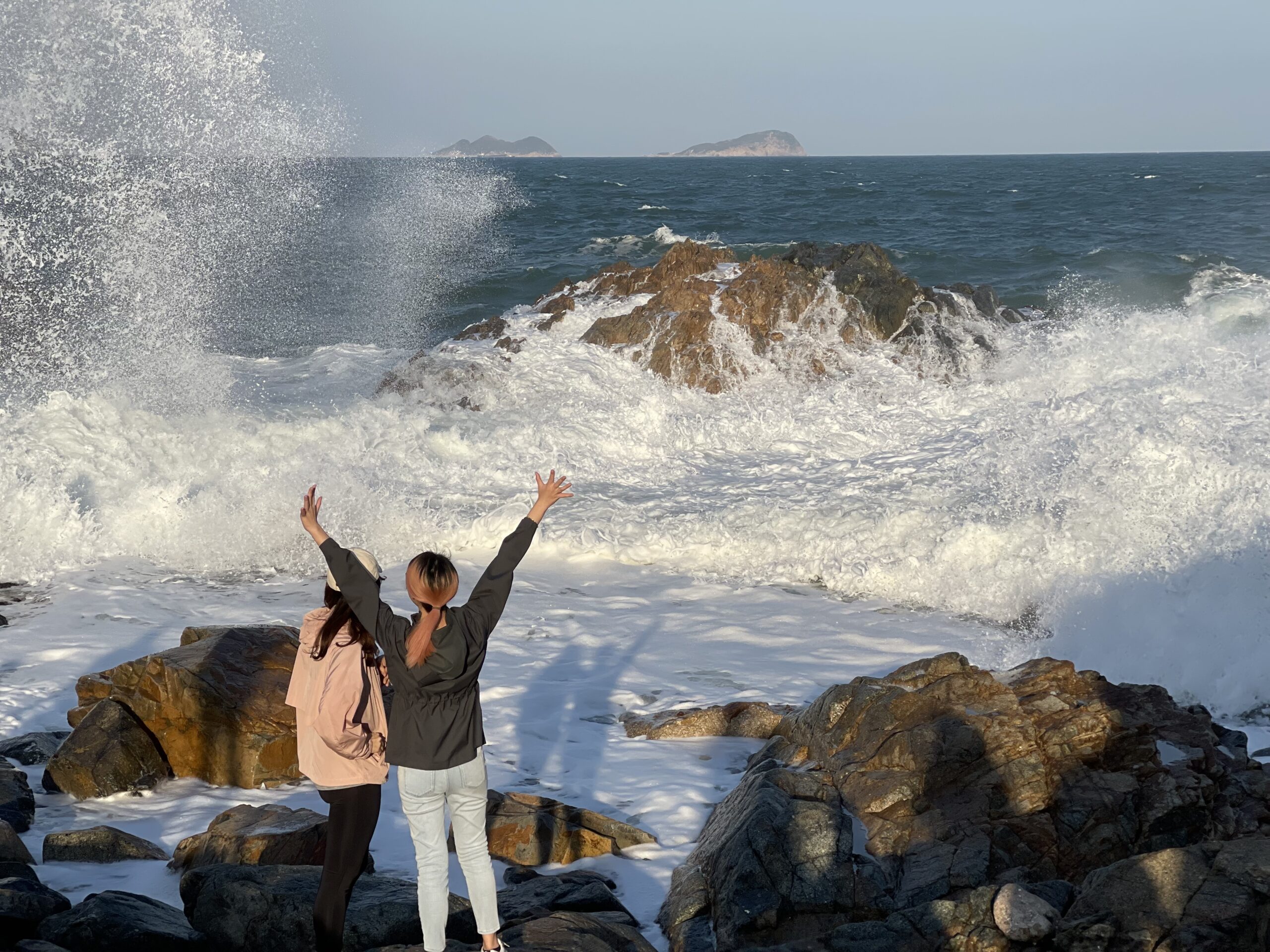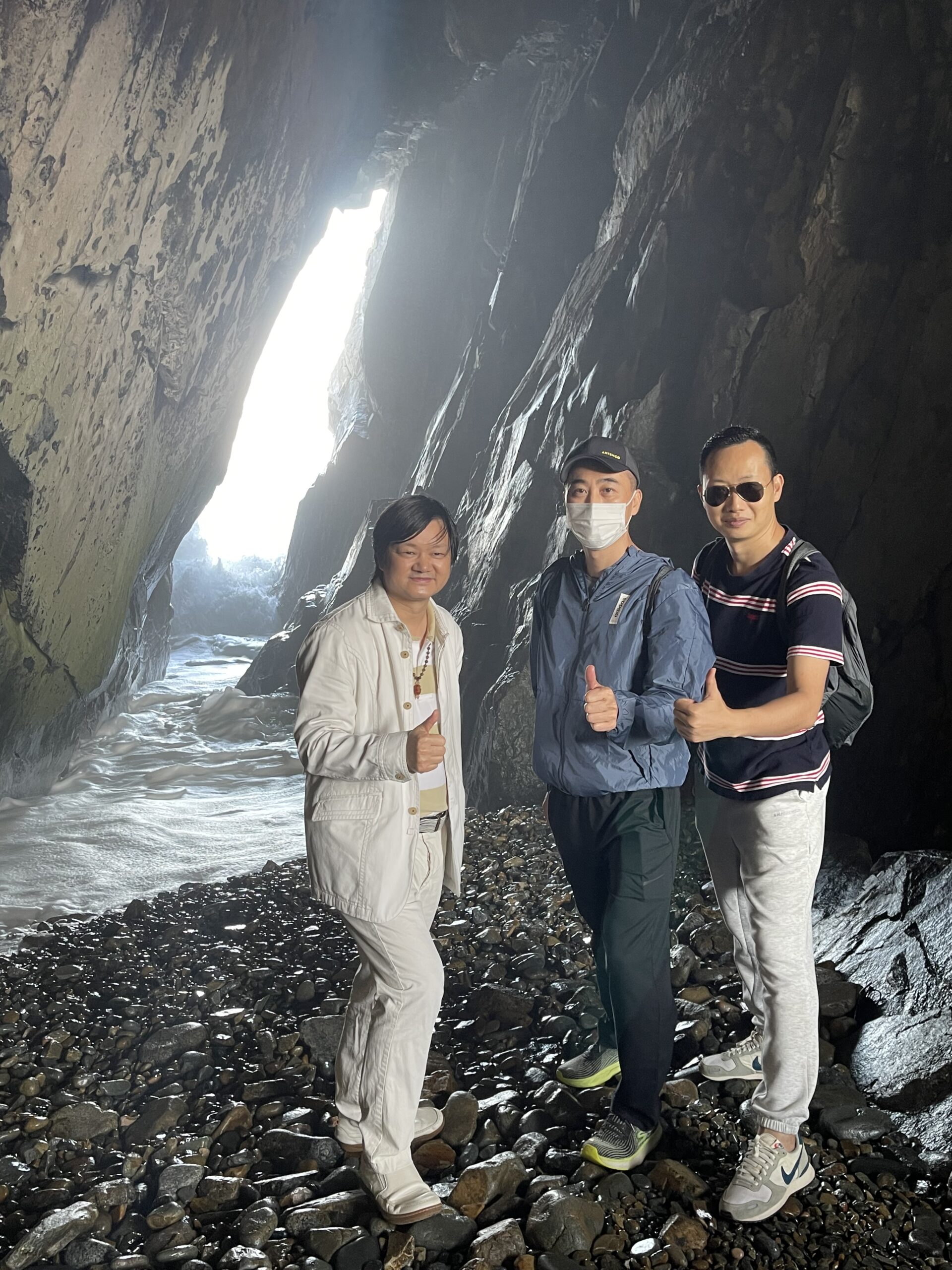 走著,聽到右邊傳來陣陣海浪撞擊岩石發出象打雷的聲和人「哦!呀!啊」的喊聲,發現很多人都聚在一個洞前排隊打卡拍照,該洞看似一線天,一邊連著海另一邊連結著山,滔滔的海水撞擊著礁石,發出雷鳴般的響聲。我們拍照時,海浪時不拍打同伴腳下,讓同伴驚叫跳腳而起。其實這個名叫雷音洞中有一個超大裂縫,每次海浪沖擊洞壁都會發出巨響,自然而然我們也打卡拍照留念。
