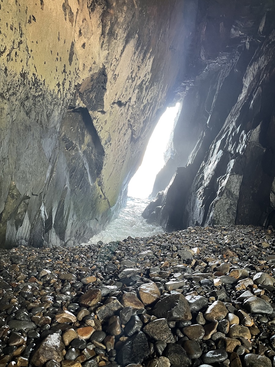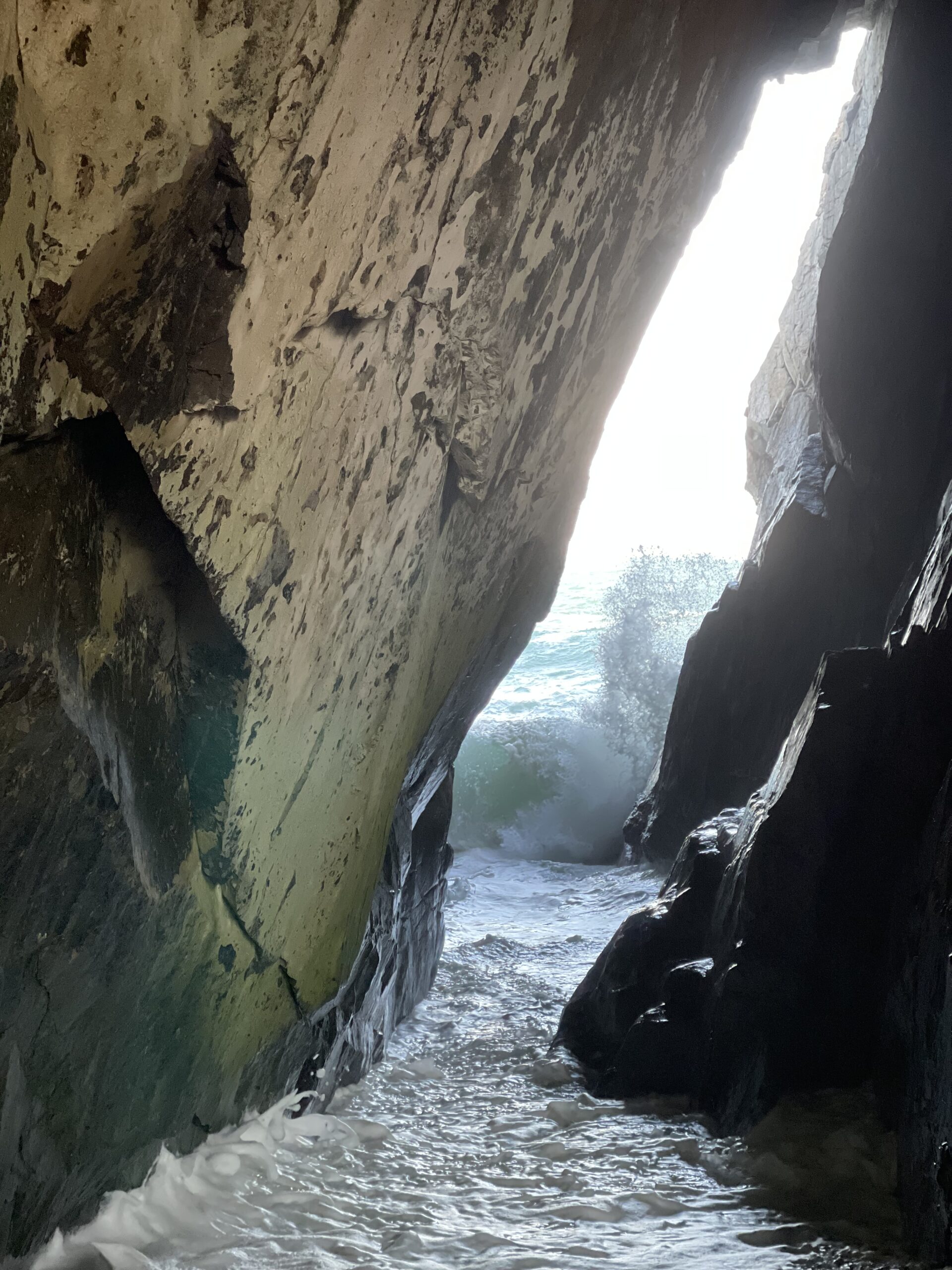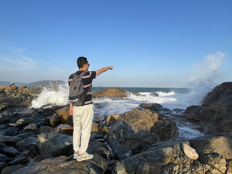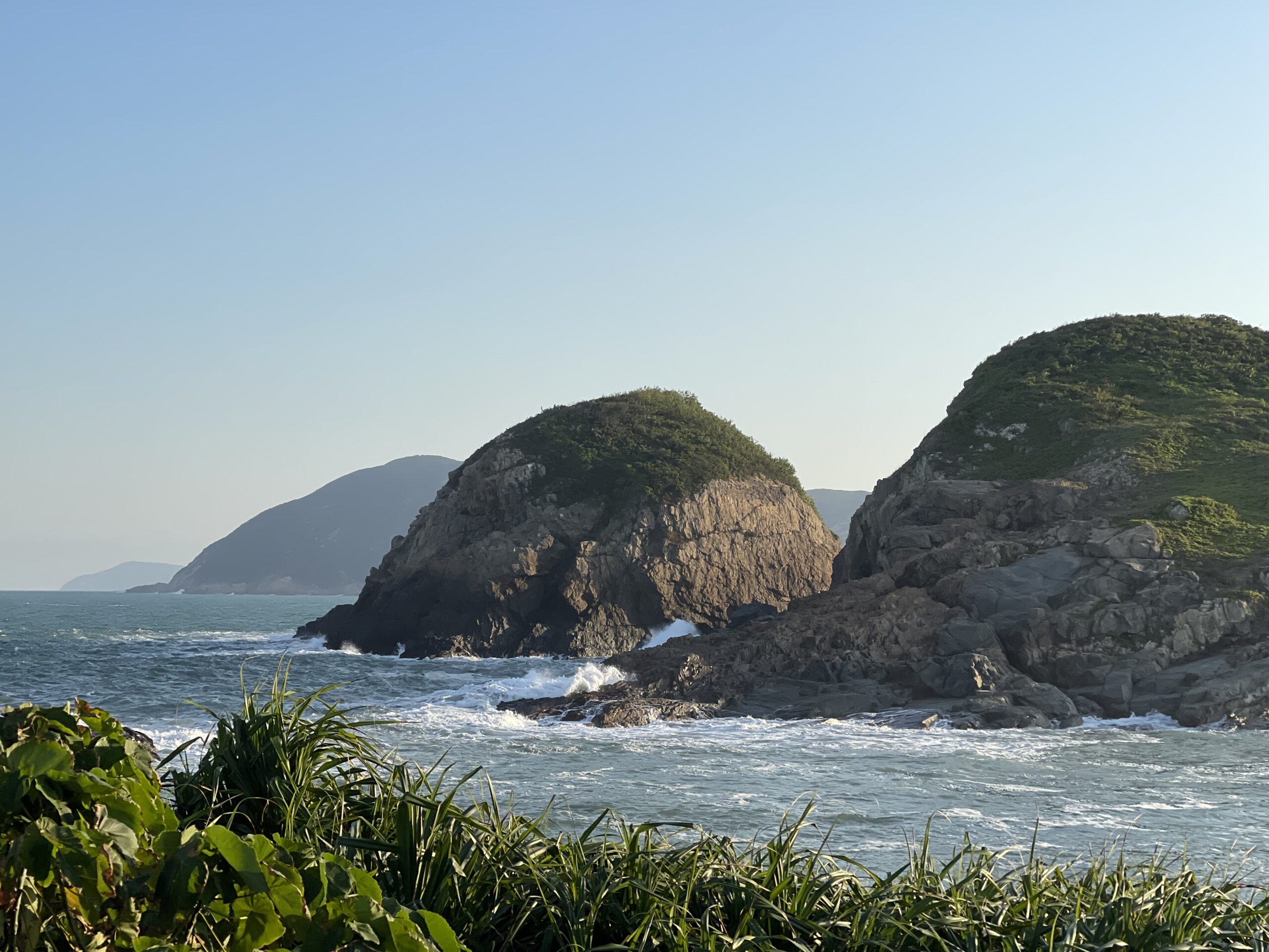走著,聽到右邊傳來陣陣海浪撞擊岩石發出象打雷的聲和人「哦!呀!啊」的喊聲,發現很多人都聚在一個洞前排隊打卡拍照,該洞看似一線天,一邊連著海另一邊連結著山,滔滔的海水撞擊著礁石,發出雷鳴般的響聲。我們拍照時,海浪時不拍打同伴腳下,讓同伴驚叫跳腳而起。其實這個名叫雷音洞中有一個超大裂縫,每次海浪沖擊洞壁都會發出巨響,自然而然我們也打卡拍照留念。